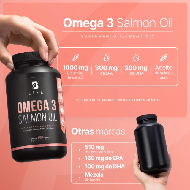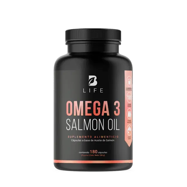 Omega 3 Salmon Oil B Life® en cápsulas contiene 1000 mg de aceite de salmón por porción. Cada cápsula aporta ácido eicosapentaenoico (EPA) y ácido docosahexaenoico (DHA), dos tipos de ácidos grasos presentes de forma natural en los aceites marinos.