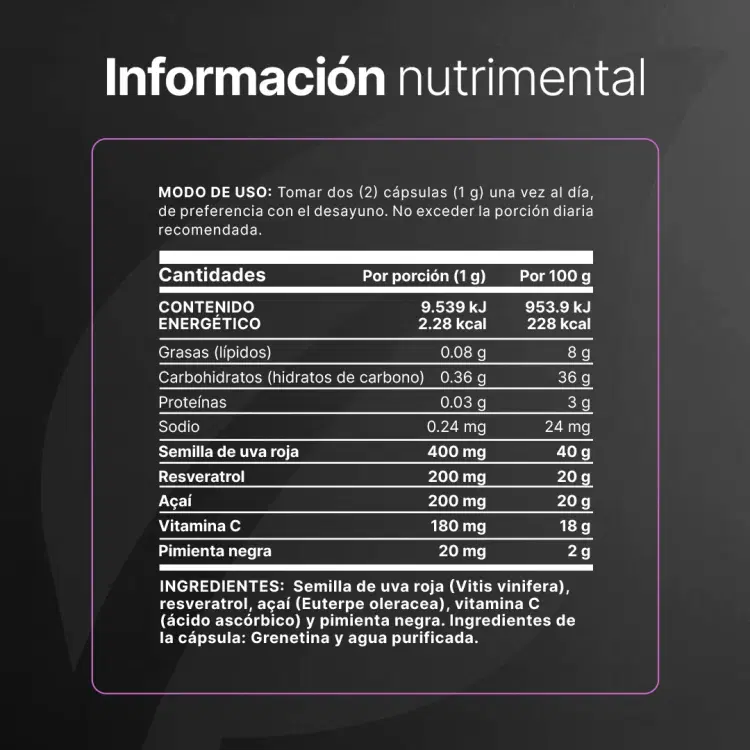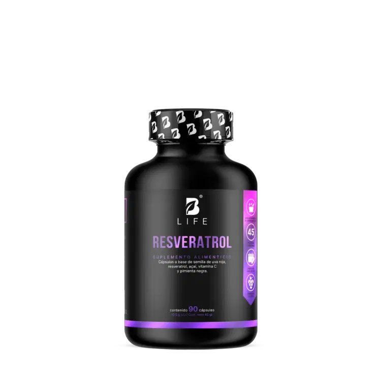 Resveratrol B Life® en cápsulas contiene 500 mg por porción, con una formulación que integra resveratrol, extracto de semilla de uva roja, açaí, vitamina C y pimienta negra, ingrediente que contribuye a una dispersión uniforme de los componentes dentro de la mezcla.